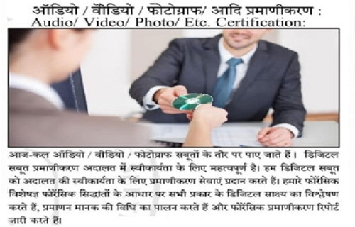 Now a day’s audio video photograph is the mostly found evidences. Where this evidence authentication is very important for admissibility in the court of law. We provide the audio, video and photographs certification services for the court admissibility of such evidences. Audio video photo 65B certification, Facebook, WhatsApp chat, Webpage, email, etc 65B certification.